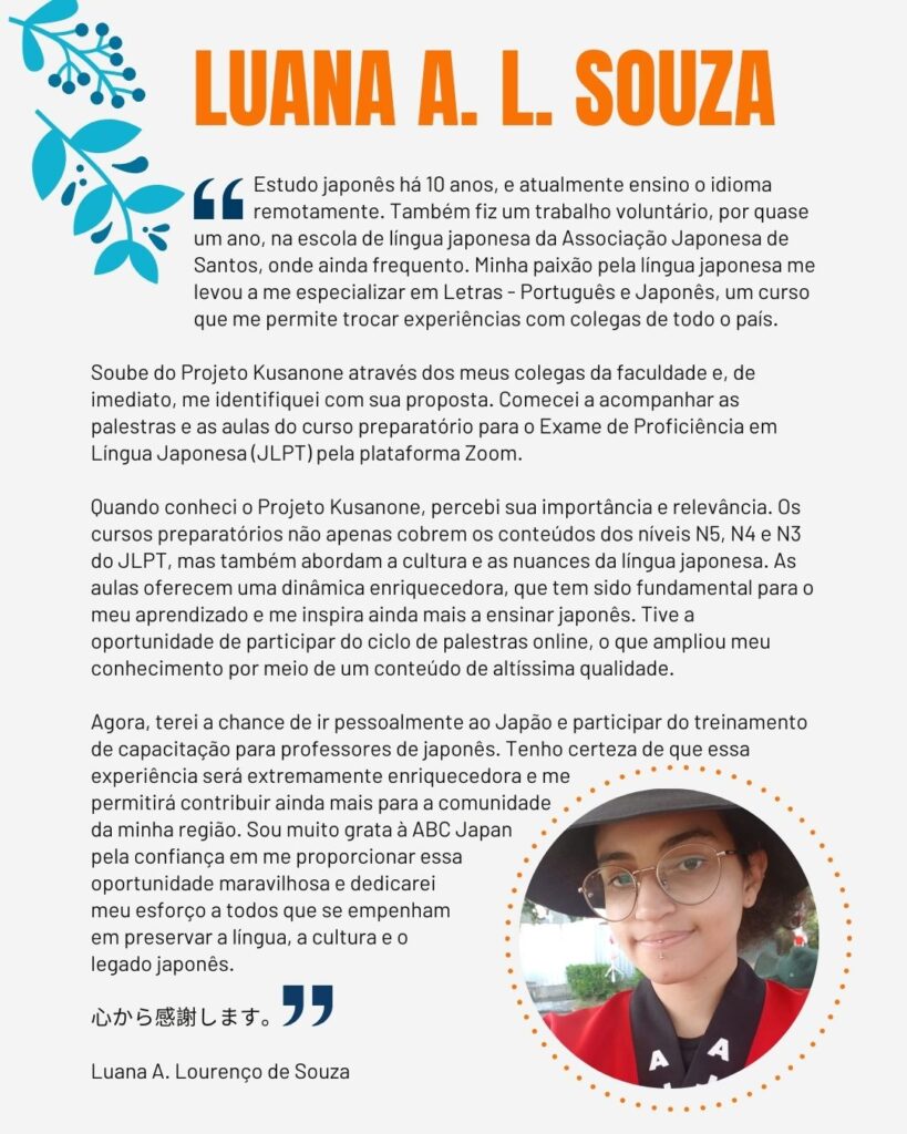 エレネ・ミツエ・コモリ(マト•グロッソ•ド•スー州ドウラドス市出身)、ルーカス・サントス・アギアール(ペルナンブーコ州レシフェ市出身)、ヴィクター・ダ・シルバ・アントゥネス(リオ•グランデ・ド・スー州ポルト・アレグレ市出身)は2024年5月に横浜でABCジャパンに歓迎され、専門のトレーニングを受けました。